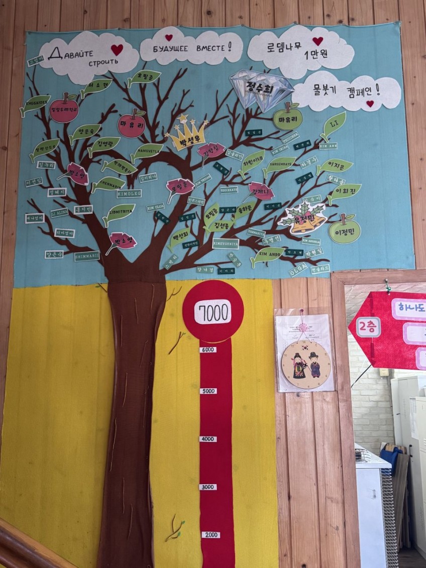 아이들에게 알려 주고 싶었다. “너희가 다니는 이 학교를 위해 누군가가 마음과 땀과 재정을 붓고 있다”는 사실을. 그리고 그 현황판을 통해 아이들 스스로도 ‘학교 짓기’에 십시일반 함께할 수 있다는 것을 눈으로 보게 해 주고 싶었다. 그림에 소질이 있는 스베타가 맡아 주었고, 멋있는 ‘로뎀나무 물붓기 현황판’이 만들어졌다. 우리는 물붓기 후원자들의 이름을 잎사귀와 열매로 달아 주렁주렁 맺히게 하기로 했다. 7천 명이 고려인학교를 짓기 위해 하나가 되어 가는 모습을 아이들에게 보여주고 싶었다. 그리고 이것이 사람의 힘만으로 되는 일이 아니라, 하나님이 함께하실 때 어떤 일들이 일어나는지를 보여주고 싶었다.